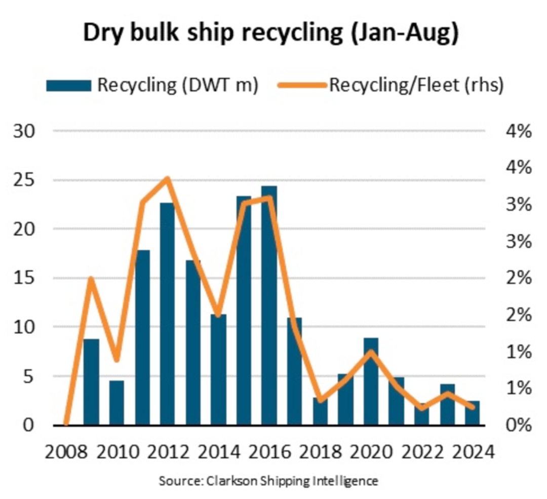 BIMCO航运分析师Filipe Gouveia日前表示,2024年1至8月,散货船拆解量同比下降了42%,是16年以来的第二低水平。货运市场的上涨行情推迟了老旧船的送拆行为。而运力供应方面,船队继续缓慢增长,船队更新受限。