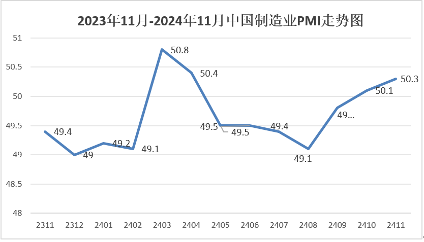 中国物流与采购联合会、国家统计局服务业调查中心发布的2024年11月份中国制造业采购经理指数(PMI)为50.3%,比上月上升0.2个百分点。(%)50%=与上月比较无变化
